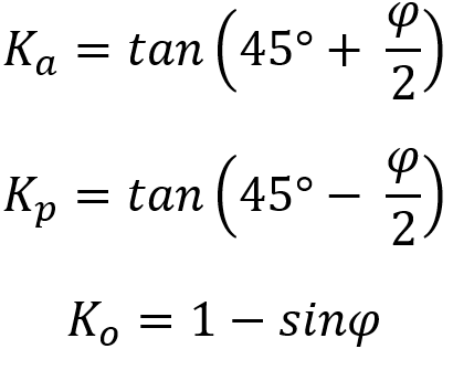 El coeficiente de empuje horizontal K será el correspondiente al promedio de los tres coeficientes de empuje que podrán existir, activo, pasivo y restante Ka, Kp,Ko :